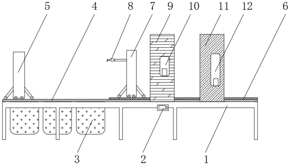 如圖1-4所示,本實(shí)用新型提供一種技術(shù)方案:一種龍門電泳、噴漆噴粉流水線,包括流水線主架1,流水線主架1的正面安裝有主控器2,流水線主架1的內(nèi)部安裝有電鍍桶3,流水線主架1的上表面安裝有兩個(gè)相平行的外滑軌4,外滑軌4的上表面滑動(dòng)設(shè)置有電動(dòng)龍門吊車5,電動(dòng)龍門吊車5的上表面安裝有內(nèi)滑軌6,內(nèi)滑軌6的上表面滑動(dòng)設(shè)置有電動(dòng)轉(zhuǎn)移車7,電動(dòng)轉(zhuǎn)移車7的內(nèi)部安裝有夾具8,且?jiàn)A具8延伸至電動(dòng)轉(zhuǎn)移車7靠近電動(dòng)龍門吊車5的一側(cè),流水線主架1的上方安裝有噴漆箱9和噴粉箱11,且噴漆箱9位于噴粉箱11的右側(cè)。