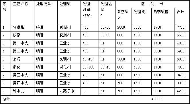1.預脫脂、2.脫脂、3.第一次水洗、4.第二次水洗、5.表調、6.磷化、7.第三次水洗、8.第四次水洗、9.純水洗、10.靜電噴塑、11.固化